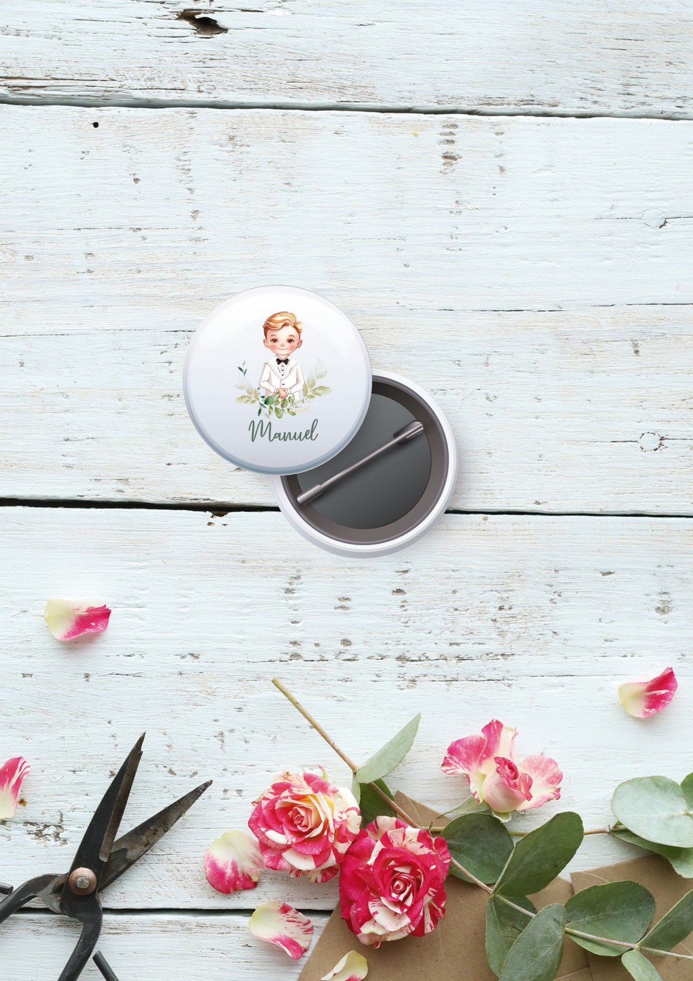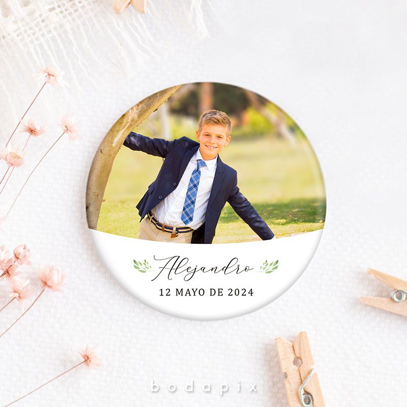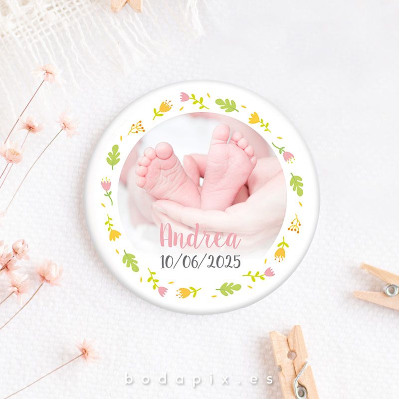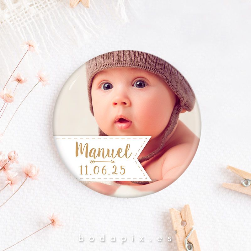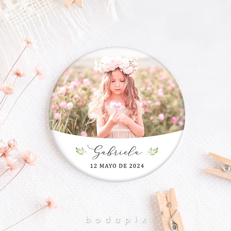 ¡Estas chapas son súper bonitas! Personalizadas con la foto que eligas, nombre y la fecha, serán ideales para regalar a tus invitados con un diseño muy original.